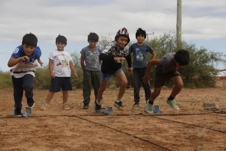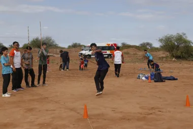 Los chicos corrieron hacia a ellos para saber mas y los aplausos de ellos era la bienvenida para esos improvisados reyes magos que arribaron y rapidamente se pusieron el overol para convertir esas tierras secas y arenosas en lugares ideales para la práctica de deportes.