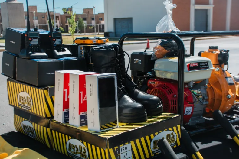 En este marco, se entregaron dos camionetas, trajes especiales para el combate de incendios forestales, equipamiento para tareas de fuego y nuevas herramientas de comunicación para mejorar la conectividad y la coordinación entre las distintas áreas del municipio, tales como antena VHF-VHFO para las comunicaciones durante emergencias, antena Starlink para la conectividad de datos de la base, handies para cada agente municipal del área y teléfonos para las movilidades y la base.