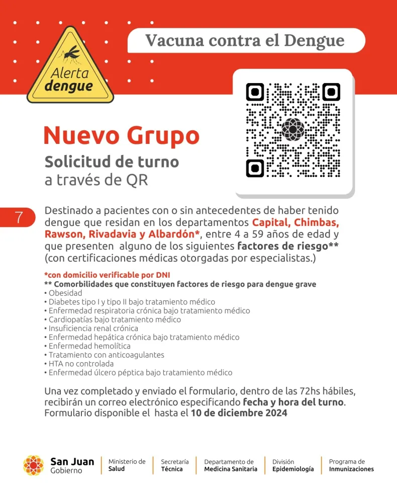 Aquellos pacientes con o sin antecedentes de haber tenido dengue que residan en los departamentos de Capital, Chimbas, Rawson, Rivadavia y Albardón (con domicilio verificable por DNI), entre 4 a 59 años de edad y que presenten alguno de los siguientes factores de riesgo (con certificaciones médicas por especialistas que lo avalen).