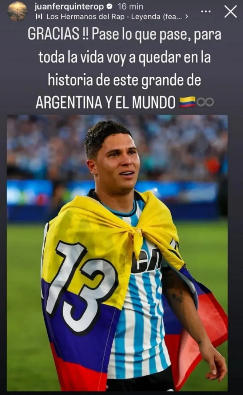 Este viernes, Quintero compartió en sus redes sociales una emotiva publicación: "GRACIAS!! Pase lo que pase, para toda la vida voy a quedar en la historia de este grande de ARGENTINA Y EL MUNDO". Aunque el mensaje es de agradecimiento, las palabras del jugador parecieron tener un tono de despedida, lo que inquietó a los hinchas que temen que su salida de Racing esté cerca.