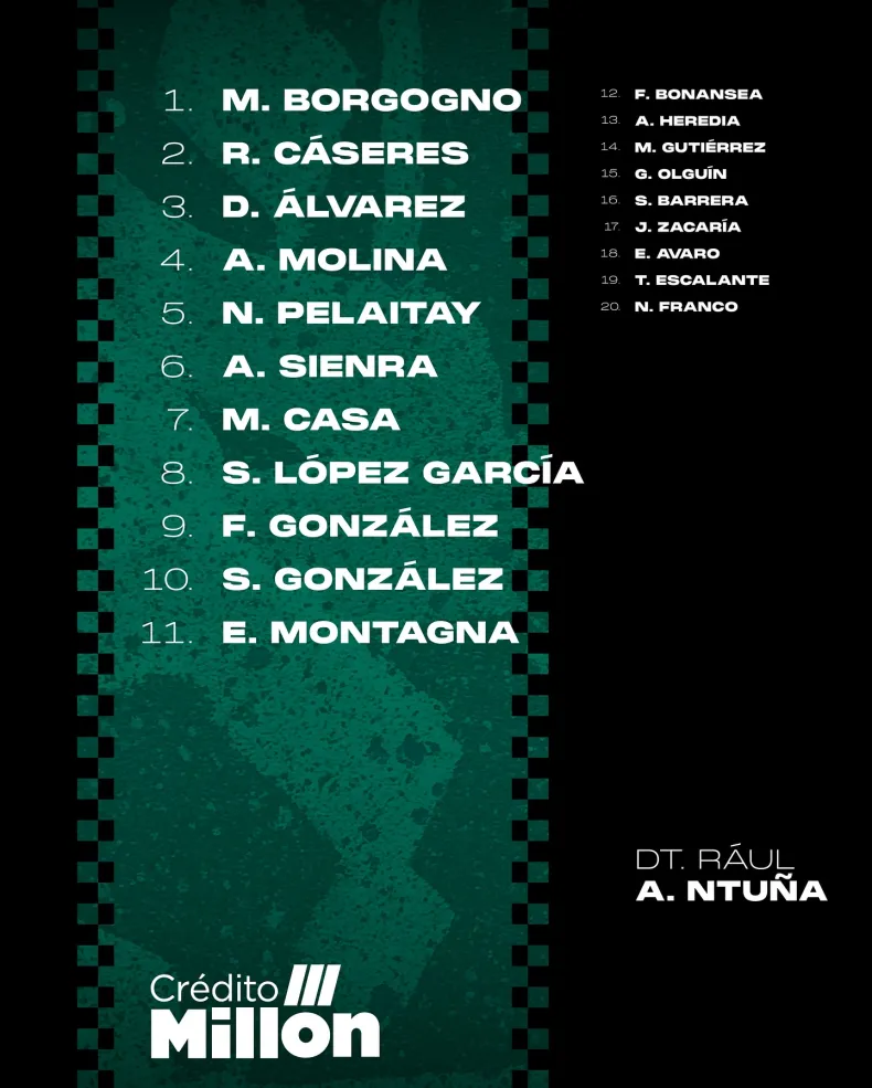 El once inicial estará compuesto por Borgogno en el arco; Molina, Cáseres, Sienra y Álvarez en la defensa; López García, Montagna, Pelaitay y Pulpito González en el mediocampo, Maxi Casa y Federico González en la delantera.