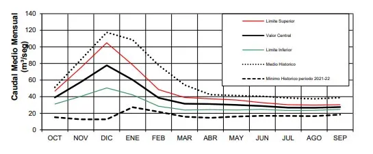 El escurrimiento del Río hasta el momento y en lo que se proyecta, sigue muy por debajo de la media histórica, por lo que se considera un periodo hídrico seco, tal cual viene sucediendo hace varios años.