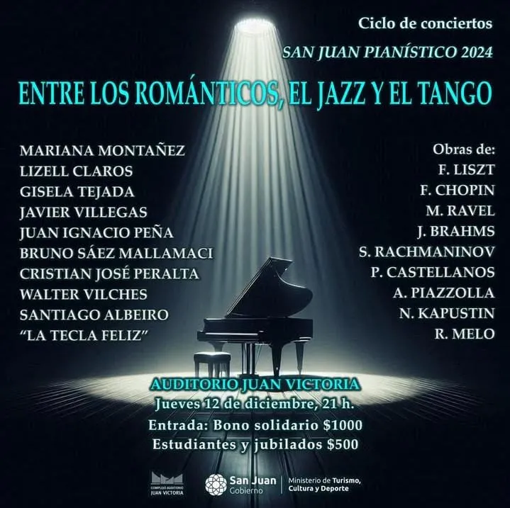 Con el auspicio del Gobierno de San Juan y el Ministerio de Cultura, Turismo y Deportes, este jueves a partir de las 21.00, el auditorio "Juan Victoria" tendrá lugar el concierto de piano denominado "San Juan Pianístico 2024", actividad incluida dentro del ciclo de concierto, que servirá para cerrar un año cargado de éxitos y del nacimiento de profesionales en este instrumento.