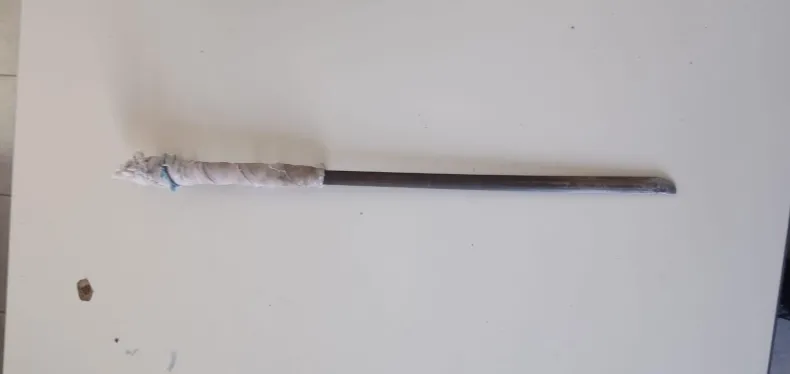 El arma, construida con una barra de hierro tipo planchuela de aproximadamente 40 centímetros de largo, tenía un filo en uno de sus extremos y una empuñadura improvisada con tela en el otro.