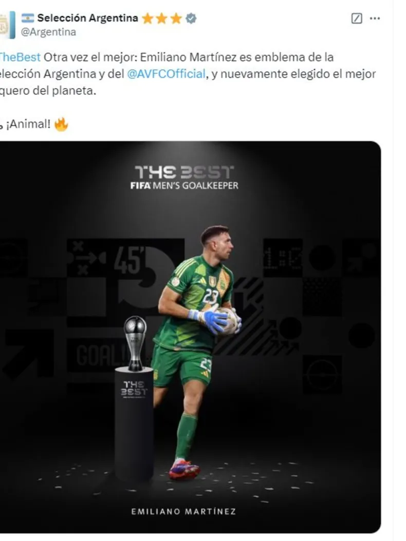 Emiliano Martínez continúa agrandando su historia en el fútbol: fue elegido en los Premios The Best de la FIFA a mejor arquero. Como ocurrió en octubre pasado, cuando se llevó el "Trofeo Lev Yashin", en la gala del Balón de Oro 2024, el "Dibu" sumó otro gran premio individual a su colección.