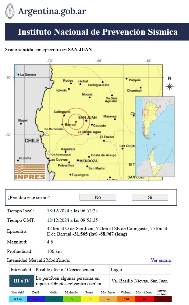 Según los datos de INPRES, el temblor se produjo a la 42km al oeste de la Ciudad de San Juan.