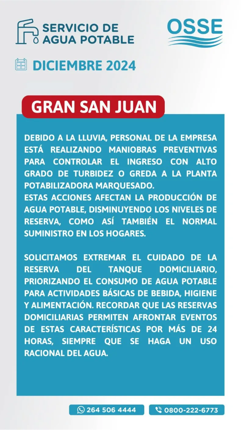 Debido a las intensas precipitaciones, personal de la empresa OSSE está realizando maniobras preventivas para controlar el ingreso con alto grado de turbidez o greda a la Planta Potabilizadora Marquesado. Estas acciones, según el comunicado oficial, afectan la producción de agua potable, disminuyendo los niveles de reserva y el suministro normal en los hogares.