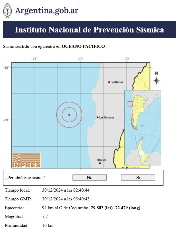 Según el INPRES, el sismo fue de 5.7 grados, a la altura de La Serena.