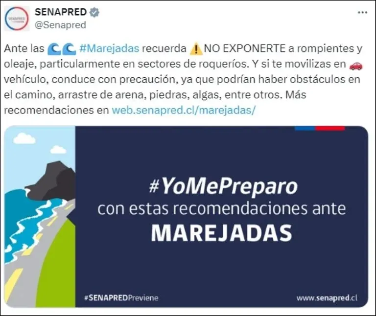 A través de sus canales oficiales, el Senapred enfatizó la importancia de evitar conductas de riesgo. "Ante las #Marejadas, recuerda NO EXPONERTE a rompientes y oleaje, especialmente en zonas de roqueríos. Si te desplazas en vehículo, maneja con precaución, ya que pueden existir obstáculos en el camino, como arrastre de arena, piedras, algas, entre otros", alertó el organismo.