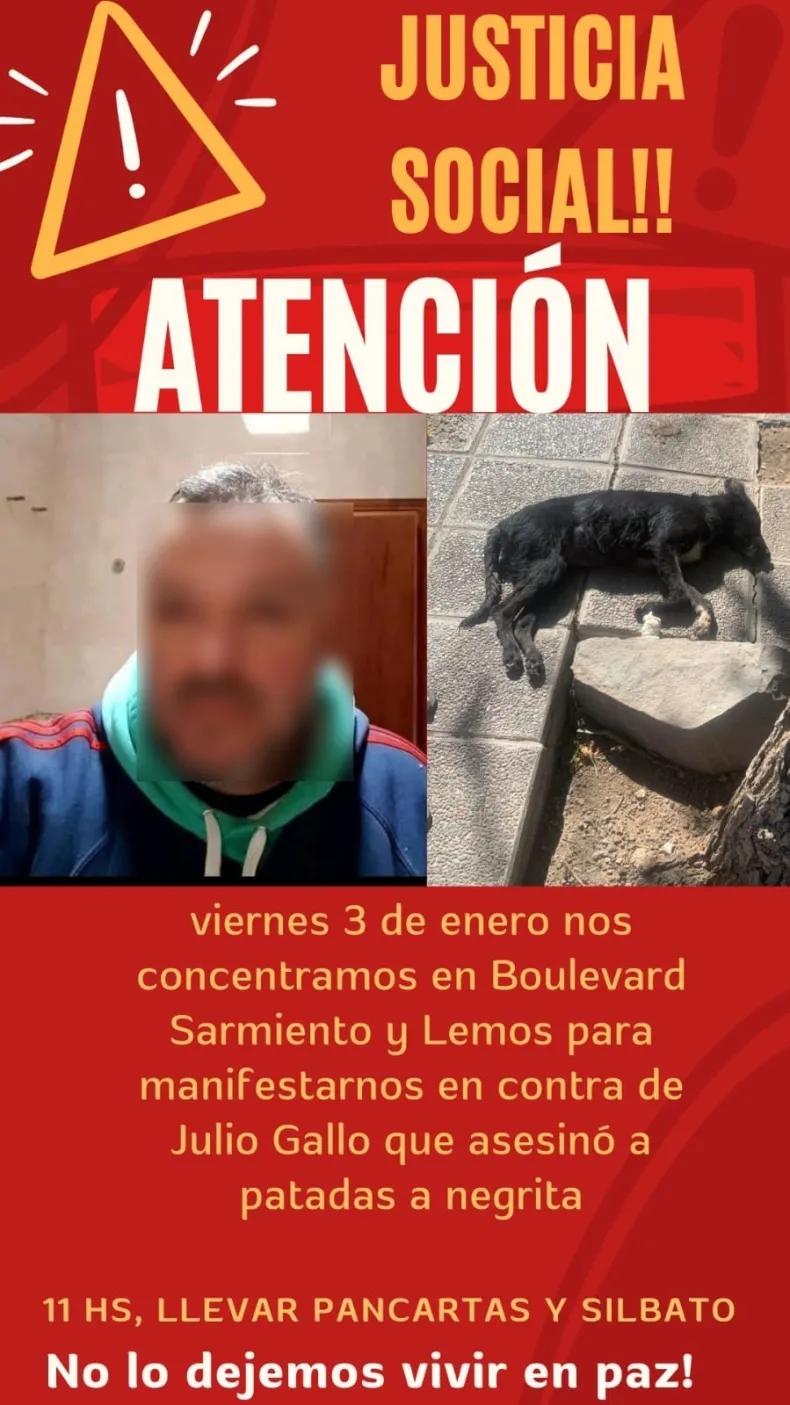 La manifestación, convocada bajo el lema "No lo dejemos vivir en paz ", contará con la participación de activistas que llevarán carteles y silbatos como forma de repudio al acto de violencia hacia el animal. En redes sociales, Emilia Merino, una de las organizadoras, expresó: "Hoy la ciudadanía completa debe decir basta. Hay estudios que prueban que donde hay maltrato animal, también hay abuso hacia seres vulnerables. Esto debe terminar y es la única forma de que los ciudadanos, como soberanos, digamos basta y exijamos penas acordes al delito, no queremos más condenas en suspenso".