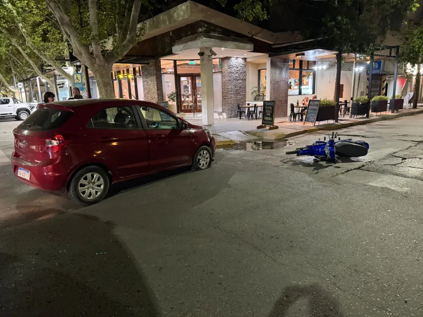 Un siniestro vial tuvo lugar anoche en la intersección de Avenida Ignacio de la Roza y calle Entre Ríos, cuando un Ford Ka y una motocicleta Keller azul colisionaron.