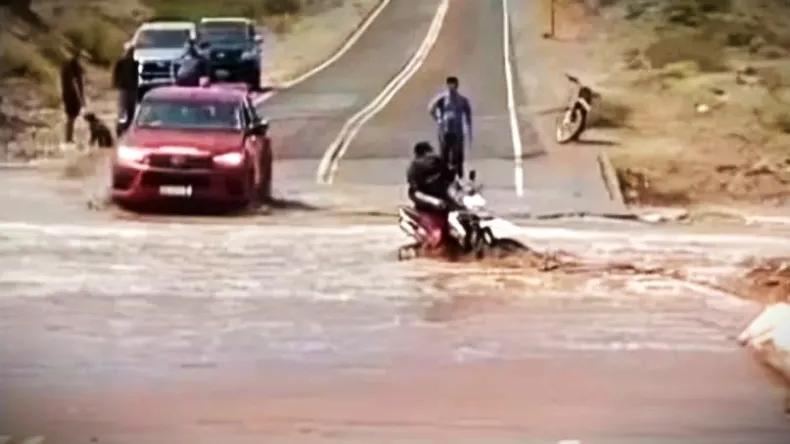 En Ullum,San Juan, un hombre intentó cruzar un río crecido en su motocicleta, desafiando la fuerza del agua. A pesar de las advertencias de los presentes, decidió avanzar, pero la corriente lo superó rápidamente, arrastrando su moto.