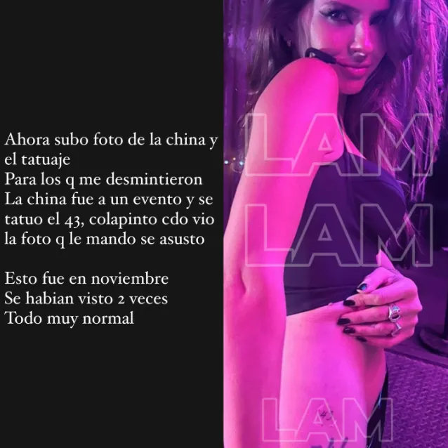 Según Latorre, el tatuaje en cuestión era el número 43, en referencia a Colapinto. "La China fue a un evento y se tatuó el 43. Cuando Colapinto vio la foto que ella le mandó, se asustó. Esto fue en noviembre; se habían visto dos veces, todo muy normal", aseguró la panelista de LAM en Instagram.