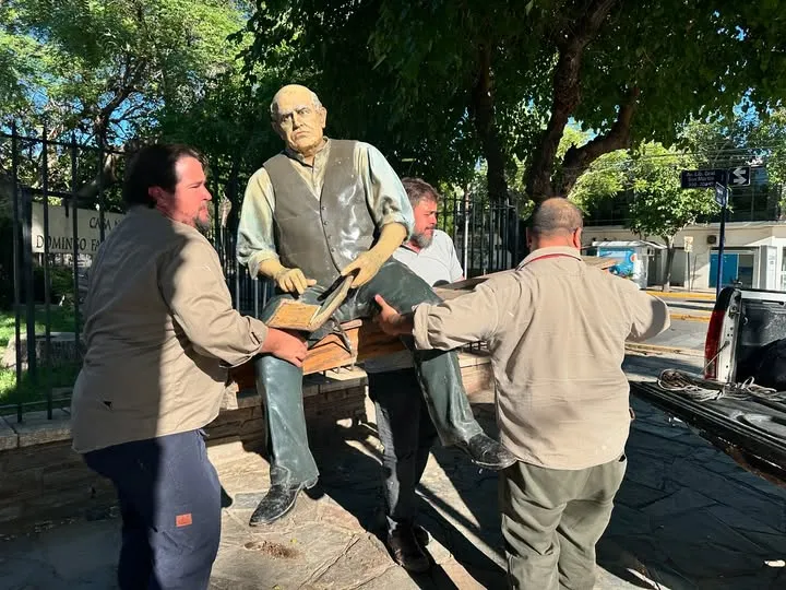 La estatua de Domingo Faustino Sarmiento, que se encontraba en la intersección de las calles Libertador y Sarmiento, fue retirada temporalmente para ser sometida a trabajos de restauración, según informó la Dirección de Infraestructura del Ministerio de Turismo, Cultura y Deporte de la provincia, a cargo de la arquitecta Libana Guzmán.