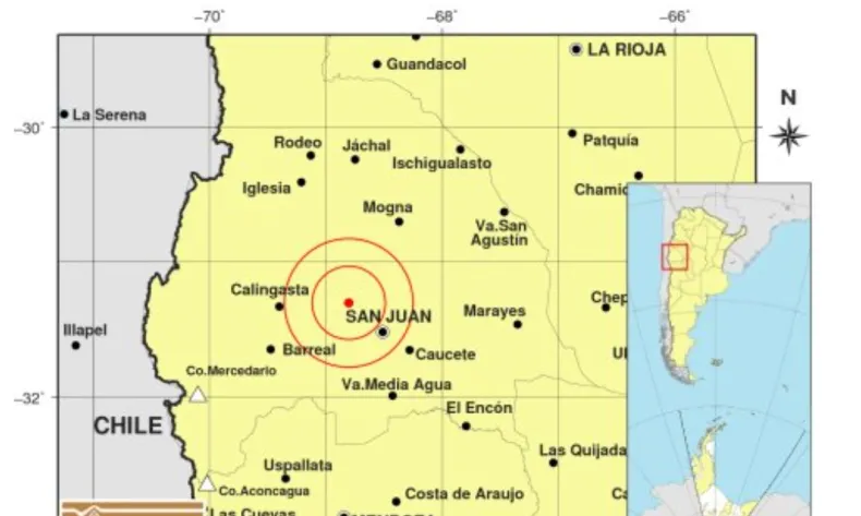 El epicentro fue localizado a 35 kilómetros al noroeste de la Ciudad de San Juan y a 58 kilómetros al este de Villa Calingasta, con una profundidad de 114 kilómetros. Esta característica del evento sísmico contribuyó a su perceptibilidad en diferentes puntos de la región.