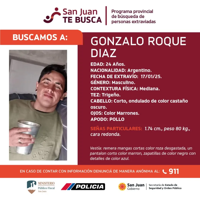 La desaparición de Gonzalo Roque Díaz mantiene en vilo a su familia y a los organismos de seguridad de la provincia. El joven fue reportado como extraviado el 17 de enero , lo que motivó la rápida intervención del Programa Provincial de Búsqueda de Personas Extraviadas , que emitió una alerta en toda la provincia a través del programa "San Juan Te Busca".