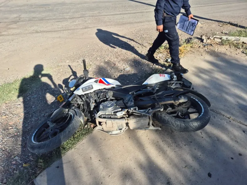 Un agente policial resultó lesionado tras chocar su moto oficial contra un automóvil en la intersección de calles Newbery y Recabarren, en Rawson.
