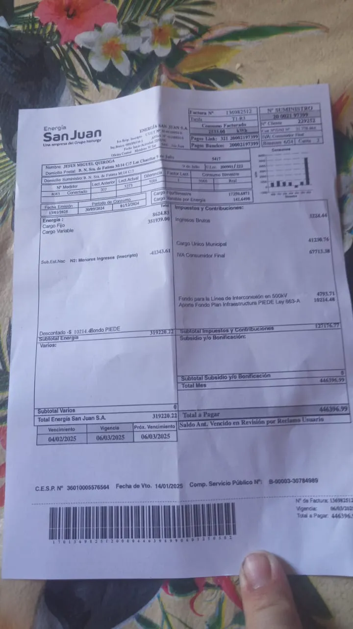 En el primero de los casos, la factura está a nombre de Jesús Miguel Quiroga, docente de escuela primaria. La esposa del hombre, Eliana García, contó que en diciembre les llegó la primera boleta de más de 446 mil pesos, el tema es que hicieron el reclamo, pero ya les llego la segunda con el mismo monto. La mujer expresó que es imposible poder pagar lo que dice, ya que tienen heladera, dos ventiladores y los focos comunes de la casa. Vale aclarar que el monto que venían pagando por el costo de la energía era de un poco más de 19 mil pesos.