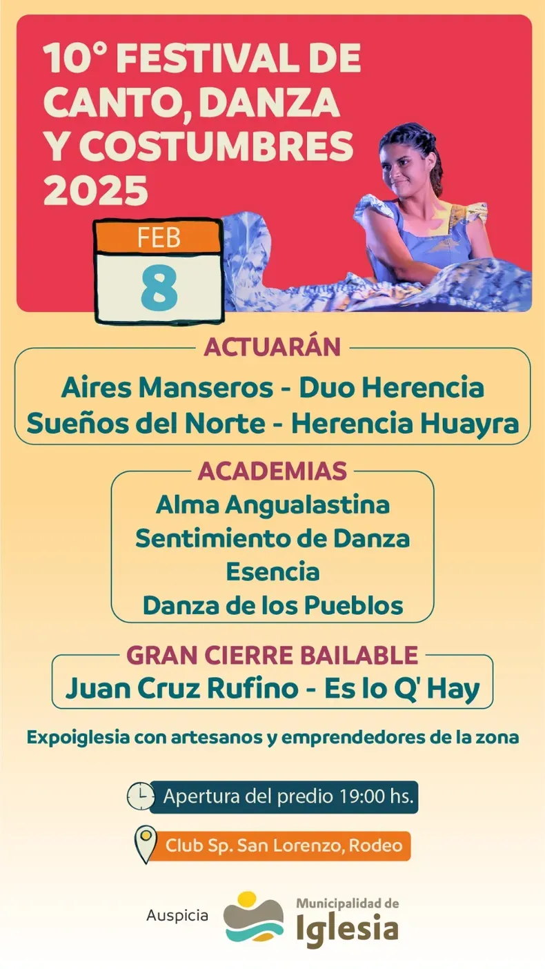 Iglesia vivirá a pleno nuevamente su tradicional Festival de Canto, Danza y Costumbres de Rodeo, en su décima edición, que tendrá lugar este sábado 8 de ferbrero a partir de las 19.00 y como ya es costumbre, su sede serán las instalaciones del Club Sportivo San Lorenzo, de Rodeo, de este departamento.