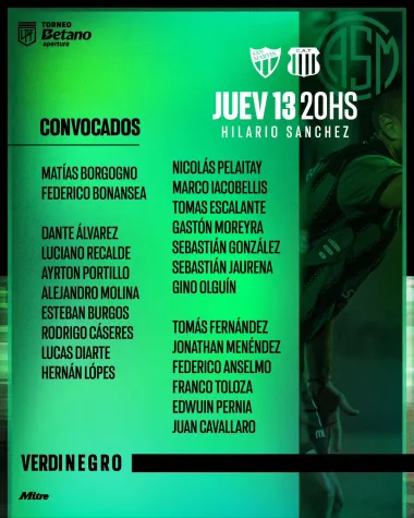Respecto de la formación del Verdinegro para mañana no está confirmada pero sería con Borgogno, Portillo, Caseres, Recalde, Burgos y Diarte o Álvarez; Jaurena, Pelaitay e Iacobellis o Sebastián González, Fernández y Anselmo.