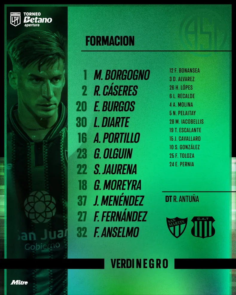 Los once para jugar con Talleres son; Borgogno, Portillo, Caseres, Burgos y Diarte, Jaurena, Olguín y Moreyra; Fernández, Anselmo y Menendez.