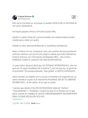 "Esta vez el Che Milei no va porque, la verdad, nunca en la historia se vio algo semejante. De Hayek pasaste a Ponzi y te fuiste al pasto MAL. Desde tu cuenta oficial de X promocionaste una criptomoneda privada, creada vaya a saber por quién. Inflaste su valor aprovechándote de tu investidura presidencial", lo acusó la ex mandataria.
