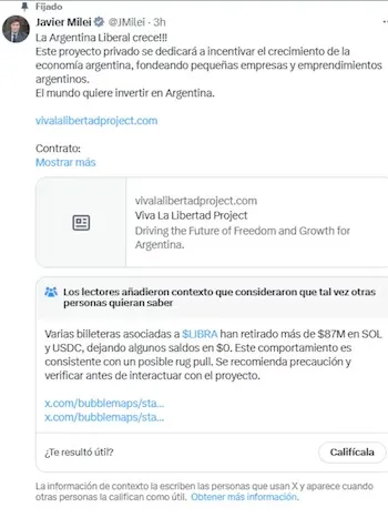 Junto al mensaje, el mandatario compartió dos links, uno con el sitio web del proyecto y otro con el tag del token de la criptomoneda $Libra. Según la página oficial de "Viva la Libertad Project", la propuesta buscaba apoyar a "emprendedores con grandes ideas", pero de inmediato surgieron advertencias sobre la viabilidad del activo digital y la posibilidad de que se tratara de un rug pull, una estafa donde los desarrolladores inflan el valor de un token y luego retiran los fondos repentinamente, dejando a los inversores con activos sin valor.