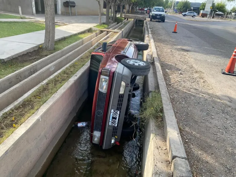 El siniestro, que por fortuna no dejó víctimas ni heridos, se registró en las primeras horas de la mañana de hoy, en la zona de UVT, en inmediaciones de la calle Las Cañitas, antes de Villagra, cuando un conductor perdió el control de su vehículo y terminó cayendo a un pequeño canal de riego.