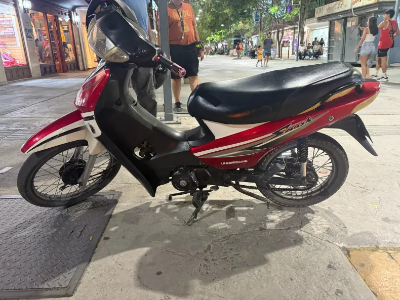 Los efectivos del Cuerpo Especial de Vigilancia realizaban recorridas de seguridad y prevención en el área de Rawson cuando visualizaron a un sujeto circulando en una moto 110 cc, marca Gilera Small, de color rojo con detalles blancos y negro, sin espejos retrovisores.