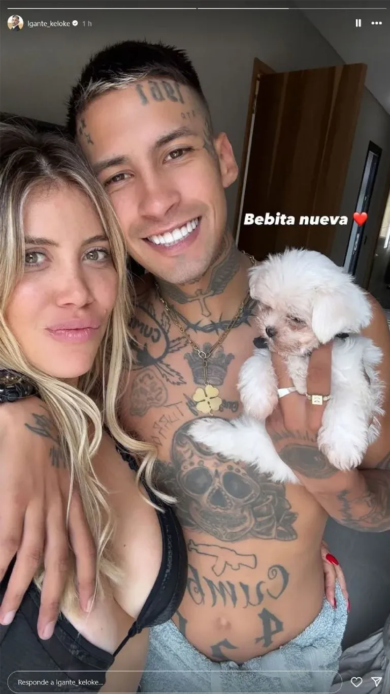"Bebita nueva", escribió L-Gante junto a la foto, revelando que la familia había crecido con la llegada de su nueva mascota. La imagen, que rápidamente se volvió viral, muestra al cantante con el torso desnudo, cubierto solo por una toalla en la parte inferior, mientras sostiene con cariño a la perra en brazos. Wanda, por su parte, aparece detrás de la cámara, capturando el momento mientras luce un sujetador negro, compartiendo la felicidad de la pareja por esta nueva incorporación.