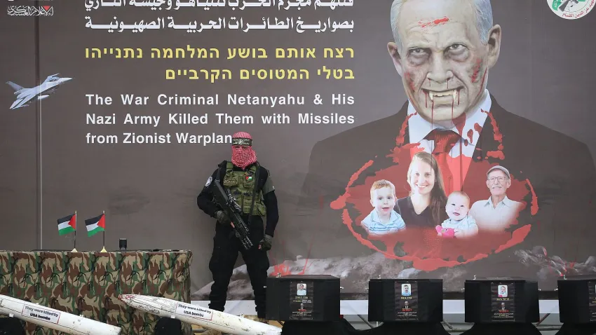 El grupo terrorista exhibió cuatro féretros en público con una imagen de los rehenes y Netanyahu antes de entregarlos a la Cruz Roja