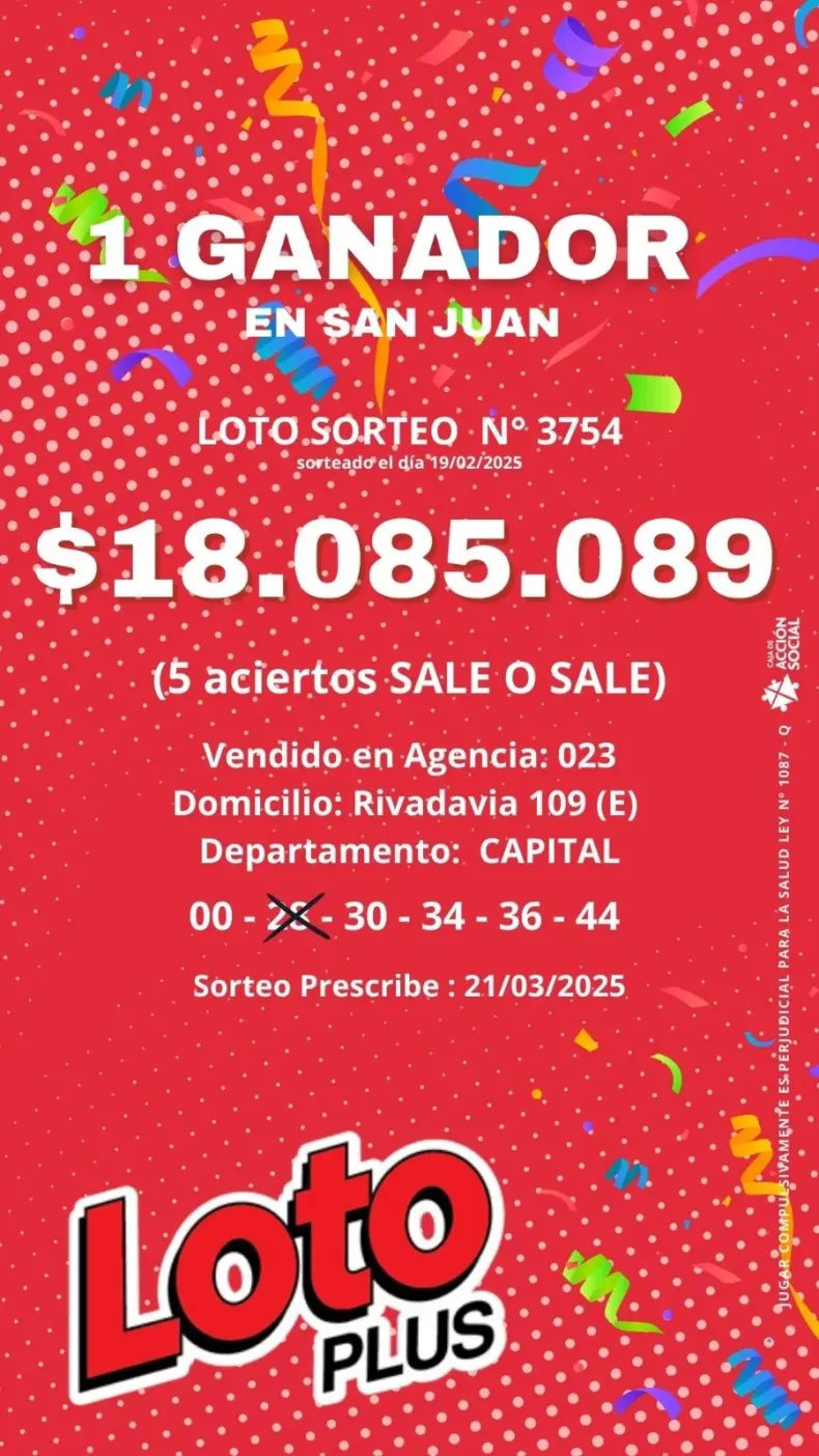 Un afortunado sanjuanino se convirtió en millonario tras acertar cinco números en el sorteo del Loto Plus, realizado el 19 de febrero. El ganador se llevó un premio de $18.085.089 en la modalidad "Sale o Sale", convirtiéndose en el nuevo millonario de la provincia.