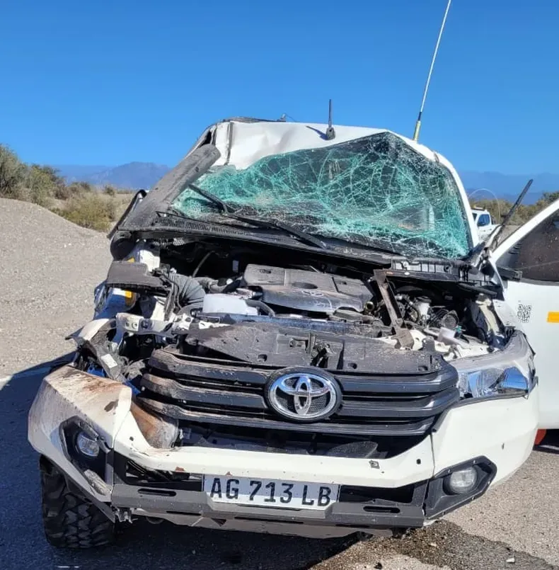 Un espectacular accidente vial con vuelco incluido, se produjo en Ruta 40, a la altura de la mina Gualcamayo, en el límite de Jáchal y La Rioja, cuando su conductor identificado como Gastón Jeremías luna, oriundo de la calle Héroes de Malvinas 1230 sur, Santa Lucia, perdió el control de la camioneta Toyota Hilux y volcó violentamente, perteneciente a la empresa Nielsen.
