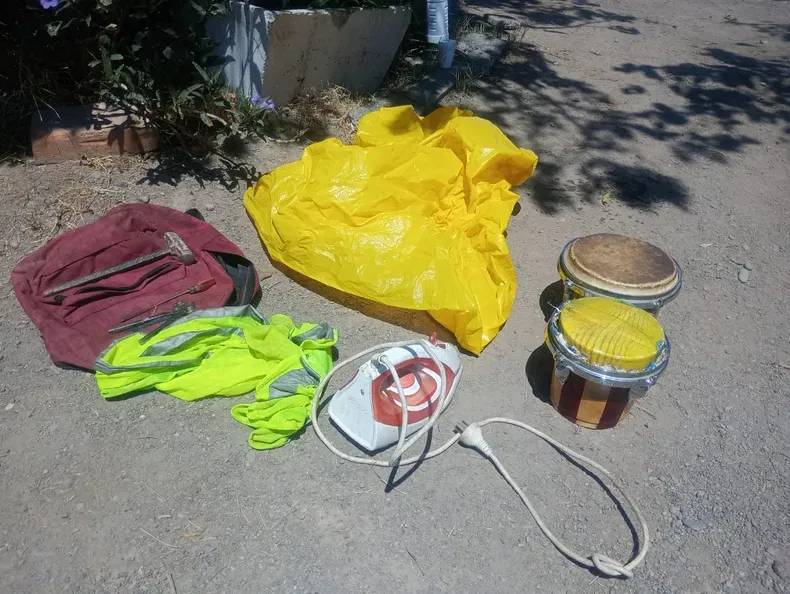 Luego de recorrer y rastrilla la zona, los uniformados encontraron diferentes electrodomésticos, un bongo y una mochila con herramientas varias, entre otras cosas.