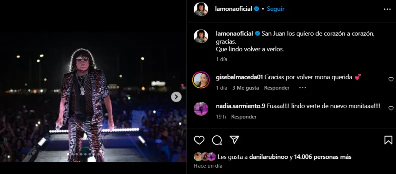 Este sábado 1 de marzo,La Mona Jiménez volvió a San Juan después de 10 años y ofreció un show inolvidable en el Estadio San Juan del Bicentenario, donde congregó a una verdadera multitud. El artista, de 74 años, desplegó toda su energía y puso a bailar a miles de sanjuaninos con su repertorio clásico, incluyendo éxitos como "Tinta China" y "Beso a Beso", que provocaron los coros más sonoros de la noche.