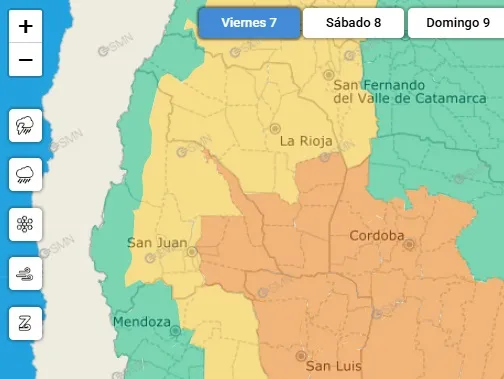 Según el SMN, la provincia de San Juan se encuentra en doble alerta, amarilla y naranja, debido a la alta probabilidad de tormentas. "El área será afectada por tormentas, algunas localmente fuertes. Las mismas podrían estar acompañadas de abundante caída de agua en cortos períodos, intensa actividad eléctrica, caída de granizo y ráfagas superiores a los 60 km/h. Se prevén valores de precipitación acumulada entre 20 y 45 mm, pudiendo ser superados en forma puntual", detalló el ente nacional.