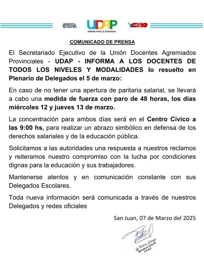 Este viernes 7 de marzo, por la tarde, el Secretariado Ejecutivo de la Unión de Docentes Agremiados Provinciales (UDAP) informó a los docentes de todos los niveles y modalidades que resolvieron una nueva medida de fuerza por 48 horas.