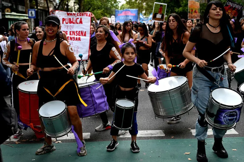 Sobre Avenida de Mayo, los grupos de percusión invitan a las manifestantes a bailar y varias mujeres jubiladas juntan firmas para que se prorroguen las moratorias, se otorgue un aumento de haberes de emergencia y se restauren algunas medicaciones gratuitas vía PAMI. "Yo iba a venir igual como cada 8 de marzo, pero además hoy traje el petitorio para que nos apoyen porque los jubilados estamos pasándola muy mal", dice Alejandra. Tiene 72 años y fila alrededor suyo para firmar el documento.
