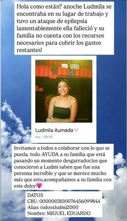 A través de las redes sociales, amigos y allegados han hecho un llamado a la solidaridad, pidiendo apoyo económico para ayudar a la familia de Ludmila en este momento tan difícil. Quienes deseen colaborar pueden hacerlo a través del siguiente alias: todosxludmi2000, a nombre de Miguel Eduardo.