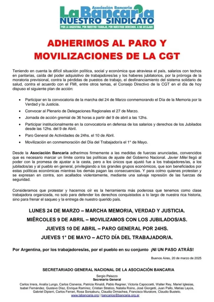 Desde la Asociación Bancaria, explicaron que su participación en el paro responde a la necesidad de marcar un límite ante las políticas de ajuste implementadas por el Gobierno Nacional. "Javier Milei llegó al poder prometiendo ajustes a la ‘casta’, pero los únicos que han pagado las consecuencias son los trabajadores, jubilados y el pueblo en general, mientras que los grandes grupos económicos continúan siendo beneficiados. Además, quienes se manifiestan en contra son sometidos a una represión violenta por parte de las fuerzas de seguridad", señalaron en un comunicado oficial, firmado por el Secretario General, Sergio Palazzo.