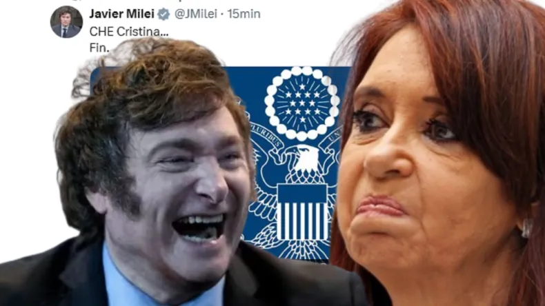 "CHE Cristina... Fin" , escribió Milei en X (antes Twitter), acompañado por el documento oficial firmado por el secretario de Estado estadounidense, Marco Rubio, en el que se informa la medida contra la expresidenta.