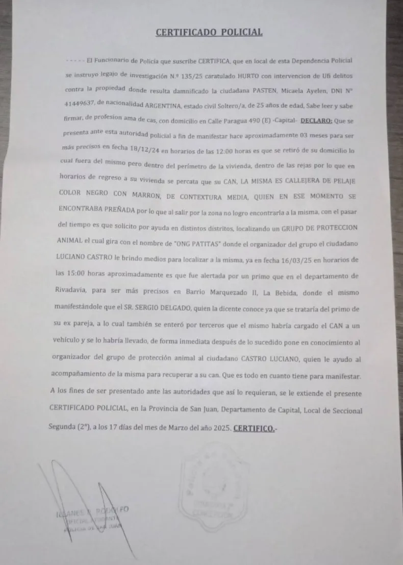 El proteccionista Luciano Castro denunció públicamente una presunta negligencia de las autoridades de Medio Ambiente de la provincia de San Juan en el caso de Cloe, una perra robada hace tres meses en Concepción. "Vengo a comentarles un caso bastante delicado por el cual estaba pasando una familia con su perra ", comenzó relatando Castro. Cloe fue sustraída de su propiedad, y su dueña no dejó de buscarla, realizando la denuncia correspondiente en el organismo provincial. Sin embargo, según Castro, "la respuesta que recibió fue un rechazo a la denuncia".