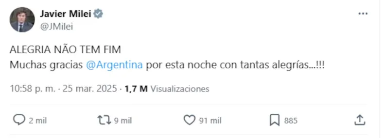 El presidente Javier Milei expresó su euforia tras la contundente victoria de la Selección Argentina sobre Brasil en las Eliminatorias Sudamericanas, calificando el partido como "un baile morboso".