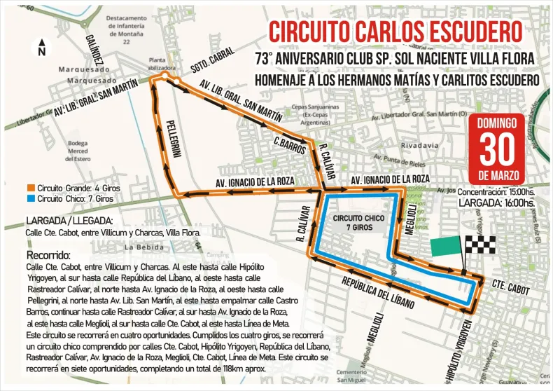 La convocatoria será desde las 16.00 con largada en calle Comandante Cabot 300 metros al oeste de San Miguel. Desde allí se iniciará un circuito que se transitará desde la bajada de bandera hasta San Miguel, por esta al sur hasta República del Líbano para luego conectar con Rastreador Calivar buscando Ignacio de La Roza para doblar a al izquierda hasta calle Pellegrini.