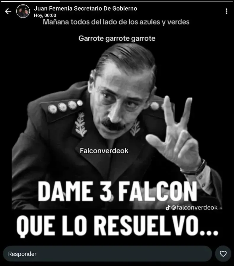El secretario de gobierno de la Municipalidad de Sarmiento publicó una foto del dictador Videla pidiendo tres falcon verdes y causó una fuerte crítica.