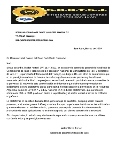 El lanzamiento de la aplicación de transporte Didi en San Juan se vio empañado este miércoles por una protesta del Sindicato de Conductores de Taxi. La empresa tenía previsto realizar un evento en un hotel de la provincia para captar nuevos conductores, pero los taxistas se manifestaron en la puerta con megáfonos y repartieron panfletos, argumentando que estas aplicaciones son ilegales y perjudican al sector.