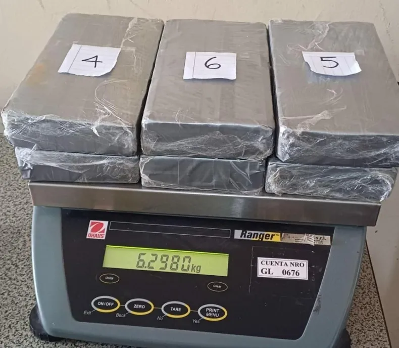 Con la participación de testigos, los gendarmes abrieron el equipaje y hallaron seis paquetes rectangulares que contenían una sustancia blancuzca. Tras ser sometida a pruebas de campo con reactivos químicos, se confirmó que se trataba de cocaína, con un peso total de 6 kilos 298 gramos, de máxima pureza.