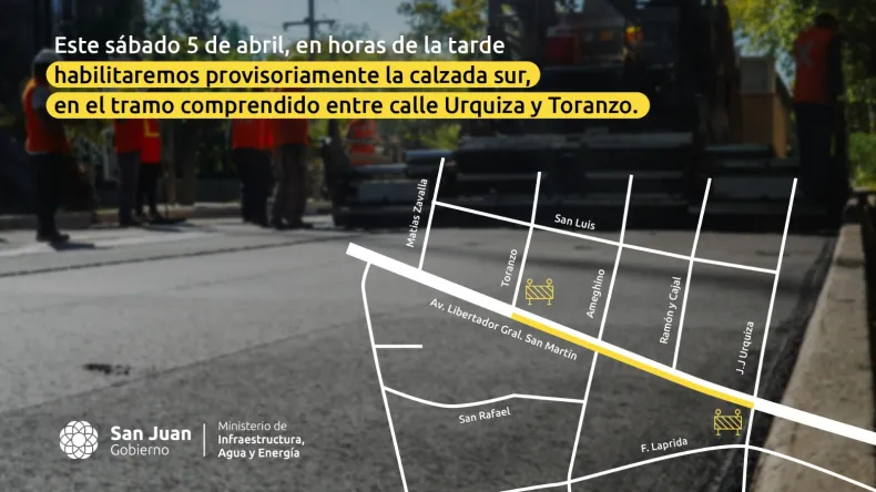 La Dirección Provincial de Vialidad informó que este sábado 5 de abril, en horas de la tarde, quedará habilitada de forma provisoria la calzada sur de avenida Libertador, en el tramo comprendido entre Urquiza y Toranzo, en el departamento Capital.