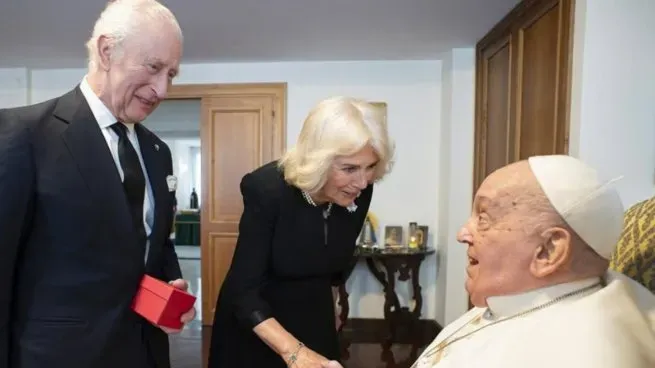 En la foto, el Sumo Pontífice aparece sentado en un sillón mientras estrecha la mano de la reina Camila y observa al rey Carlos III, quien sostiene un obsequio y se mantiene de pie. La reunión se extendió por aproximadamente 20 minutos y fue confirmada por la oficina de prensa de la Santa Sede pocas horas antes de realizarse, ya que dependía de la evolución clínica del Papa.