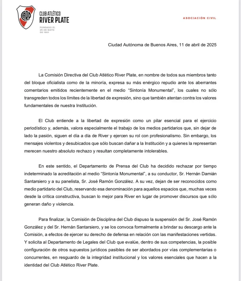 Ambos no pueden ingresar a realizar la cobertura de los partidos de River en el Monumental y al equipo de Sintonía Monumental le quitaron la insignia de equipo partidario.